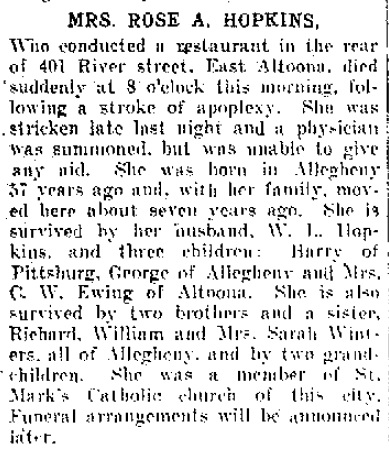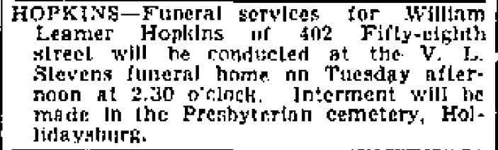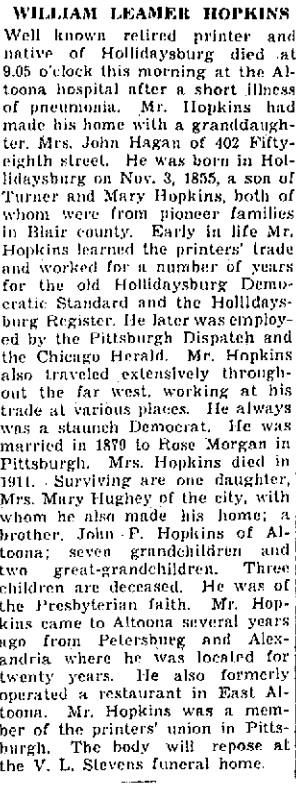 William Leamer & Rose A HOPKINS Well known retired printer and native of Hollidaysburg died at 9:05 o’ciock this morning at the Altoona hospital after a short illness of pneumonia. Mr. Hopkins had made his home with a granddaughter. Mrs. John Hagan of 102 Fifty-eighth street. He was born in Hollidaysburg on Nov. 3, 1855, a son of Turner and Mary Hopkins, both of whom were pioneer families in Blair county. Early in life Mr. Hopkins learned the printers’ trade and worked for a number of years for the old Hollidaysburg Democratic Standard and the Hollidaysburg Register. He later was employed by the Pittsburgh Dispatch and the Chicago Herald. Mr. Hopkins also traveled extensively through-out the far west living in San Diego for a number of years working at his trade at various places. He always was a staunch Democrat, He was married in 1870 to Rose Morgan in Pittsburgh. Mrs Hopkins died in 1911. Surviving. are one daughter,: Mrs. Mary Hughey. of the city, with whom he also made his home; a brother. John P. Hopkins of Altoona; seven grandchildren and; two great-grandchildren. Three children are deceased. He was of he Presbyterian faith. Mr. Hopkins came to Altoona several years ago from Petersberg and Alexandria PA where he was located for 20 years. He also formerly operated a restaurant in East Altoona. Mr. Hopkins was a member of the printers’ union in Pittsburgh. The body will repose at he V. L. Stevens funeral home