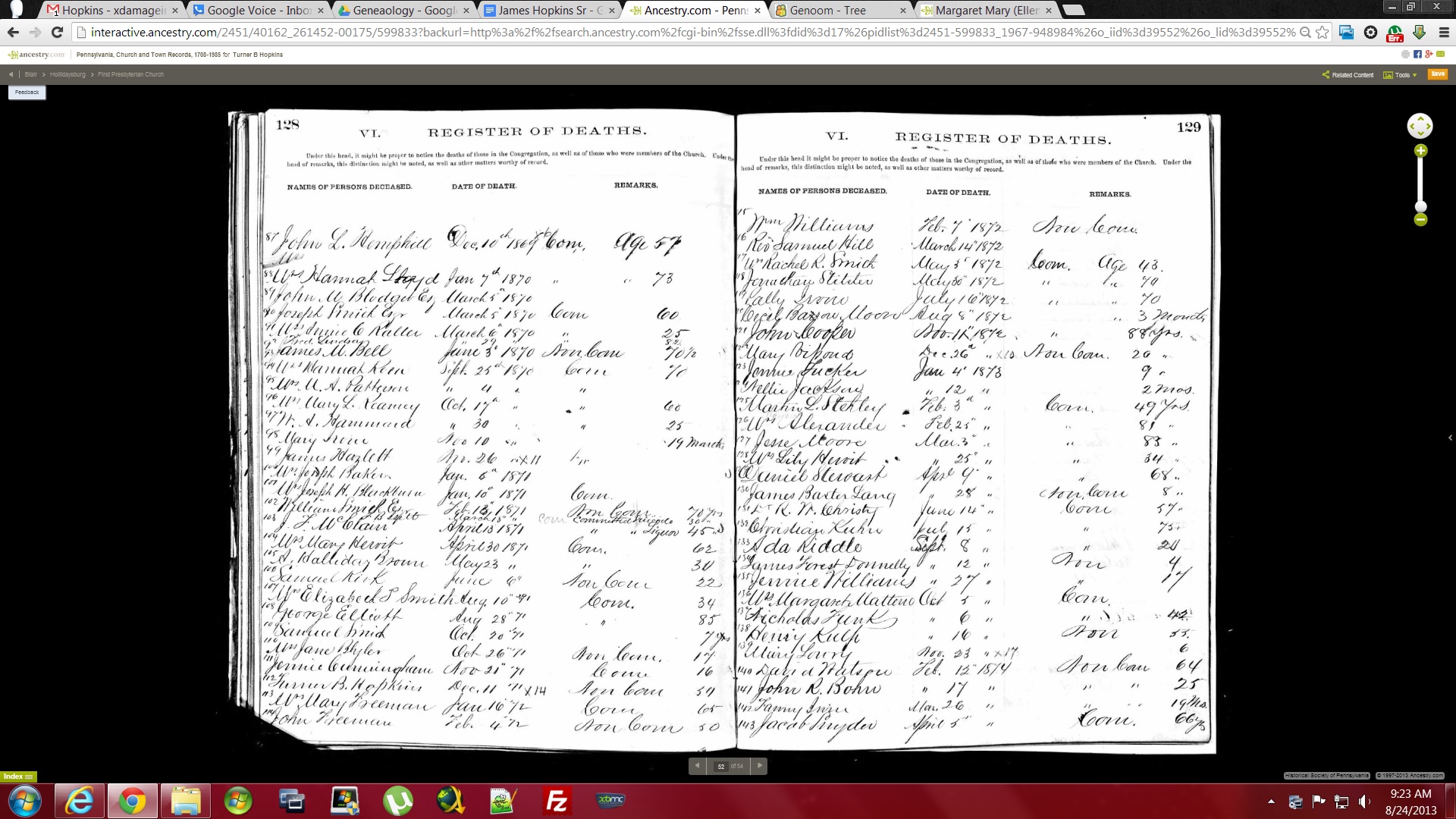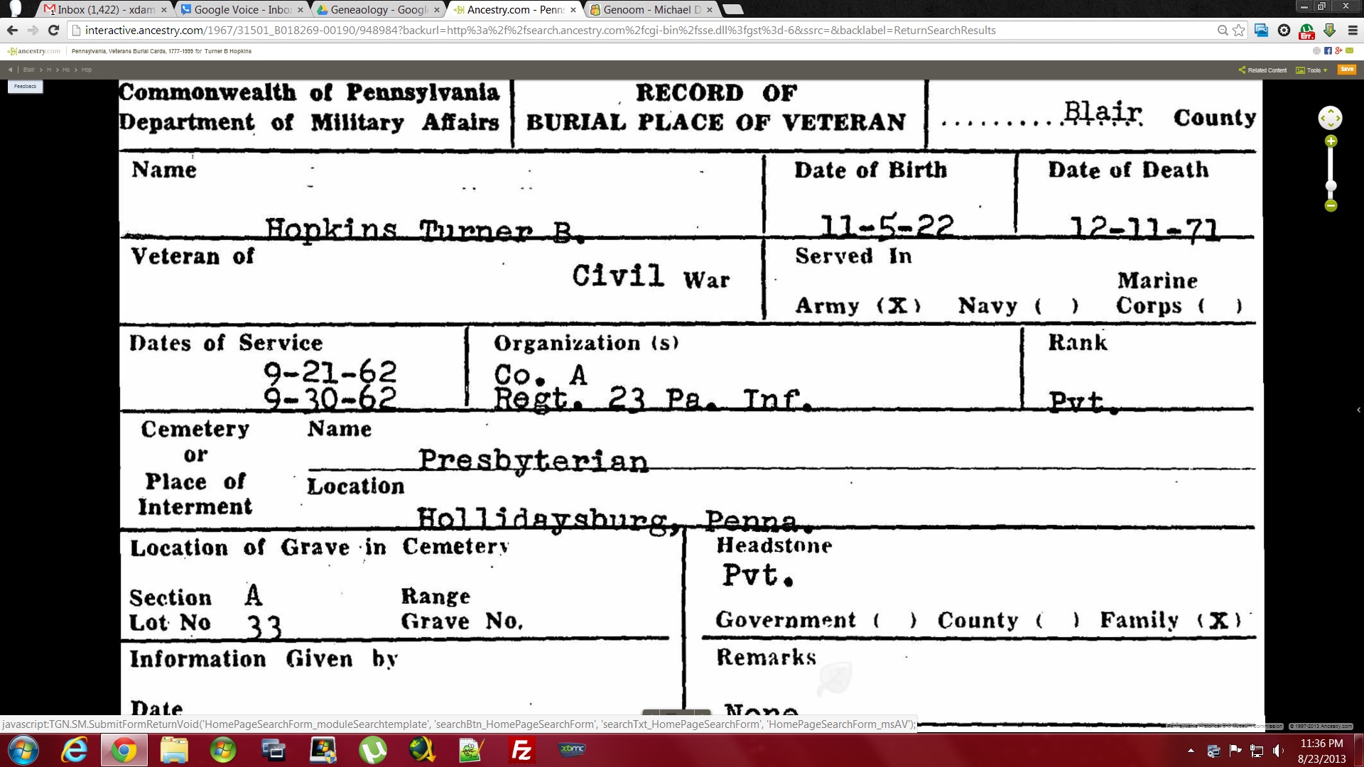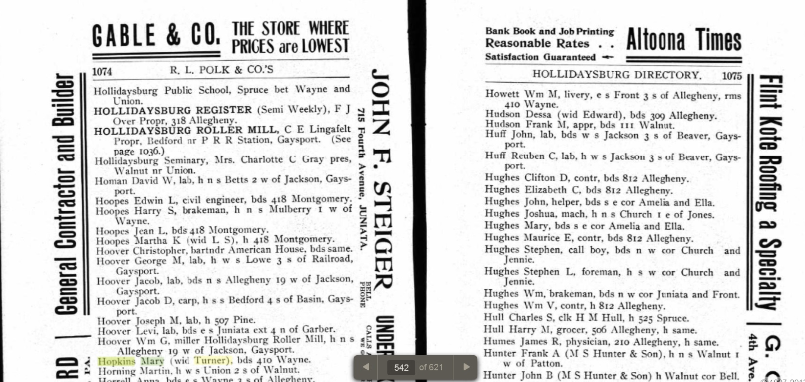 It is thought that Turner’s middle name Bell came from the friendship of the Bell family [ from where Bellwood, PA (Bell’s Mills) ] originated from as was common in the pioneer days to take a close family surname for a childs middle name. Turner Bell Hopkins’ GG Grandparents are buried next to the John SR Bell in Logan Valley Cemetery in Bellwood, PA. (Formerly Mary Ann Forge Cemetery)